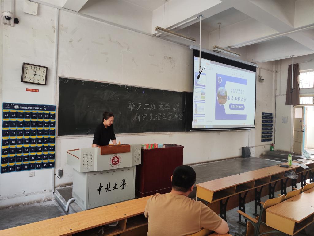 宣讲团老师重点介绍了解放军航天工程大学的学科概况、导师队伍、学校自然环境与基础设施建设、研究生培养方案等,并就考生关注的招录比例、就业前景、奖助政策等热点话题与同学们进行了交流。最后,宣讲老师与同学们进行了答疑互动,耐心细致地解答了学生关心的导师选择、培养方案、宿舍安排等问题。同时她也希望同学们能够坚持发扬拼搏进取的精神,不断钻研,不断拓新。