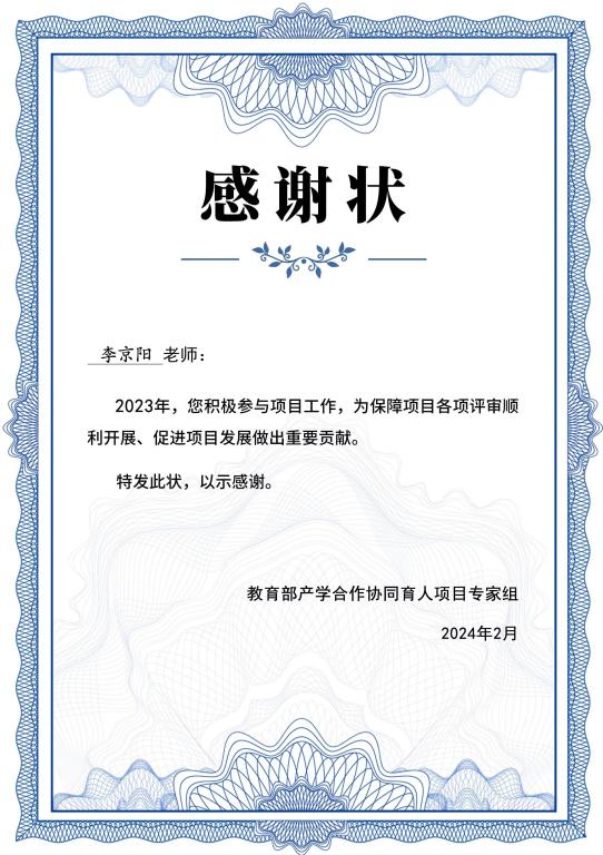 2023年,李京阳院长积极参与教育部产学合作协同育人项目,大力支持项目组各项工作的开展,为保障项目各项评审顺利开展做出积极努力,为此,教育部产学合作协同育人项目专家组制作感谢状发来感谢信,感谢李京阳院长为促进项目发展做出突出贡献!