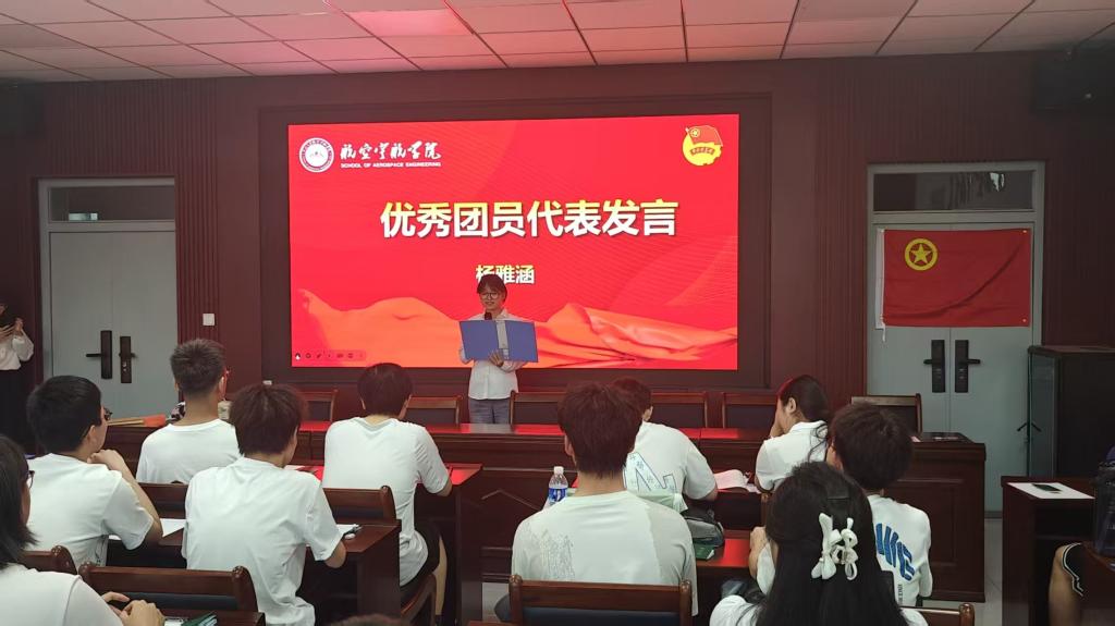 优秀团员代表杨雅涵结合自身成长经历,分享了在团组织引领下投身科研、服务集体的奋斗故事。她勉励新发展团员以“空天报国”为志向,用奋斗书写青春华章,让团徽在逐梦征程中熠熠生辉。
