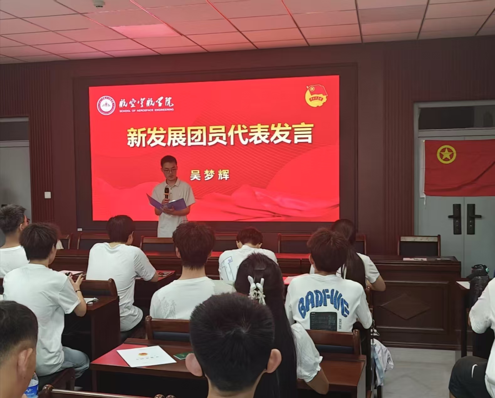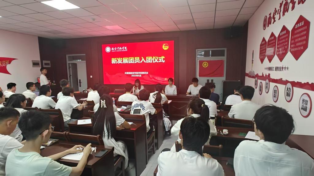 仪式在雄壮的国歌声中启幕,全体人员肃立齐唱,激昂旋律激荡起炽热的家国情怀。随后,新发展团员面向团旗庄严宣誓,他们目光坚定、右拳高举,以铿锵誓言许下“为共产主义事业奋斗终身”的承诺,将赤诚初心铭刻于心。新发展团员代表吴梦辉发言时难掩激动之情,他表示将以“勤学笃行、实干担当”践行团员使命,在航空宇航领域挥洒青春汗水,为强国事业添砖加瓦。