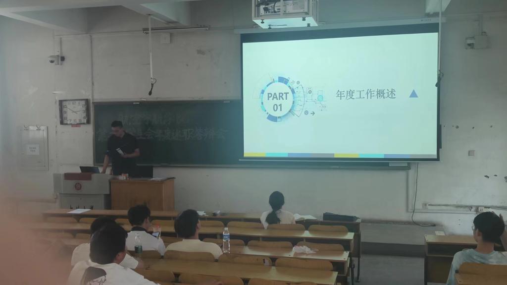 学生会主席团成员冯炜凯就本学年学生会工作的开展情况进行述职汇报。他围绕思想引领、权益维护、文体活动、组织建设等方面回顾了学生会的工作,他提到,一年来,学生会不断推动组织体系规范化、学生服务全面化、工作改革纵深化,着力打造“富有理想、关心同学、清新阳光”的服务型学生组织,矢志奋斗,不忘初心,助力学院发展、服务学生成长成才。同时也指出了学生会存在的问题。接着,学生会各部门分别围绕各自工作开展情况进行述职。