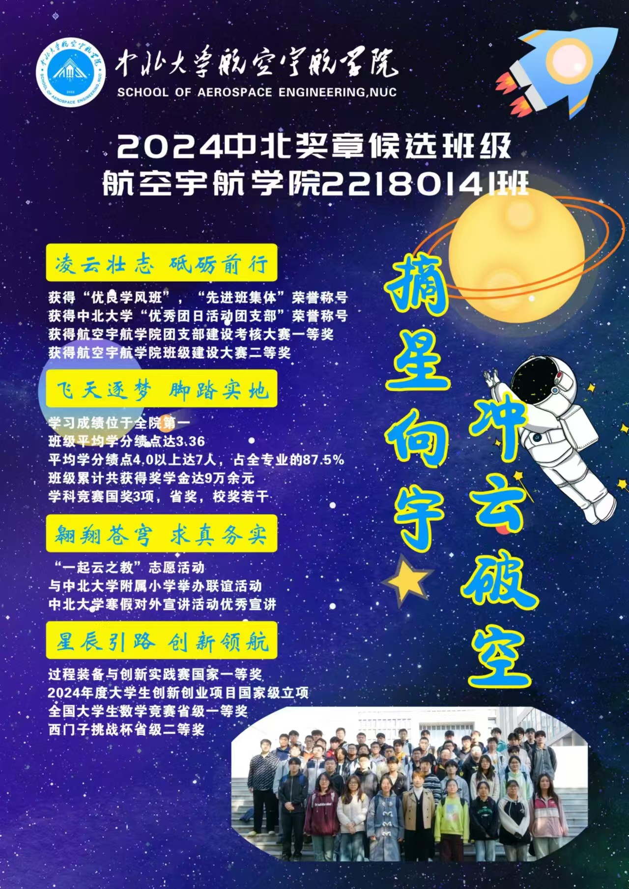 50名志同道合同学,相遇在中北,组成了22180141班。我们在段雪倩老师的引领下,共同学习,共同成长。班级学风优良,同学勤奋好学,积极进取,成绩优异。班级同学优秀率高达52%,学分绩点超过4.0的同学有7人,占专业的87.5%。在各项学科竞赛中屡获佳绩,展现出航空宇航学子的拼搏精神。我们团结友爱,互帮互助,积极参与各类公益活动,用实际行动传递爱心,践行社会责任。我们班级文化氛围浓厚,定期举办学习分享会、文体活动,增进同学间的友谊,提升班级凝聚力。